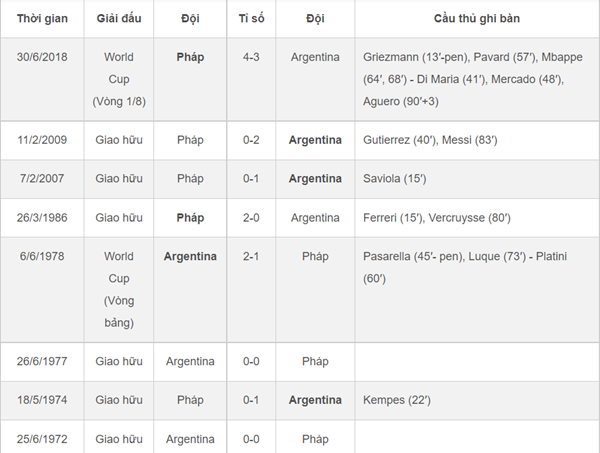 Lịch sử đối đầu Argentina vs Pháp.