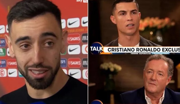 Với màn trình diễn ấn tượng, Bruno trở thành tâm điểm của buổi phỏng vấn sau trận. Đáng chú ý bên cạnh những vấn đề chuyên môn, cựu cầu thủ Sporting Lisbon còn được đặt những câu hỏi xoay quanh người đồng đội Ronaldo, sau những phát biểu dậy sóng của tiền đạo 37 tuổi về Man Utd.