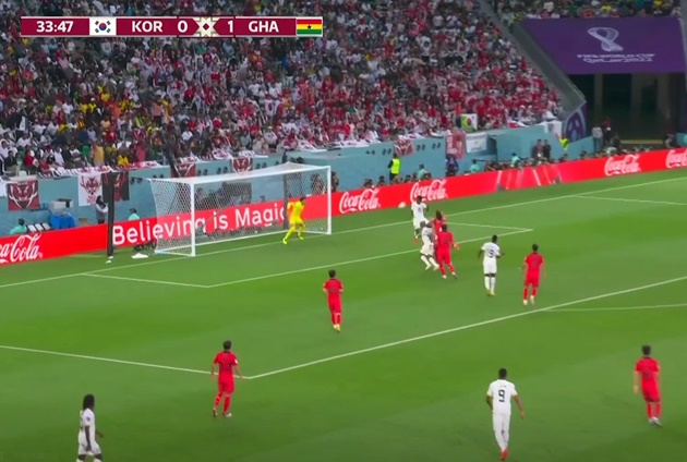 Phút thứ 58, Lee Kang-In vừa vào sân đã tung ra cú tạt miễn chê giúp Jo Gue-sung đánh đầu rút ngắn cách biệt. Ngay lập tức sau đó, lại chính Jo Gue-sung khiến mành lưới Ghana rung lên. Lần này, cú đánh đầu của anh thực sự ấn tượng khi số 9 Hàn Quốc bật cao như chim để đánh bại Lawrence Ati Zigi.
